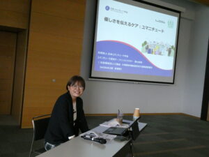 以上の3点をまとめられました。最後の質問で、目をつむったままの方に対し、見つめることはわかるのでしょうかという問いに対し、先生は2年間目をつぶったままの女性に、普段通りの声かけと、持てる力の活用で少しずつ動けるようになり、車いすでアイスクリーム屋さんへ行けるまでになった方の事例を教えて下さいました。やはり人として向き合うことが大切で、「見る」「話す」「触れる」「立つ」の4つの柱を使い、「あなたを大切に思っていますよ。」というメッセージを相手が理解できるように伝えることが大切だと理解できました。先生の「私たちが、ケアをあきらめたらだめなんですよね。」という呼びかけが心に残った講義でした。